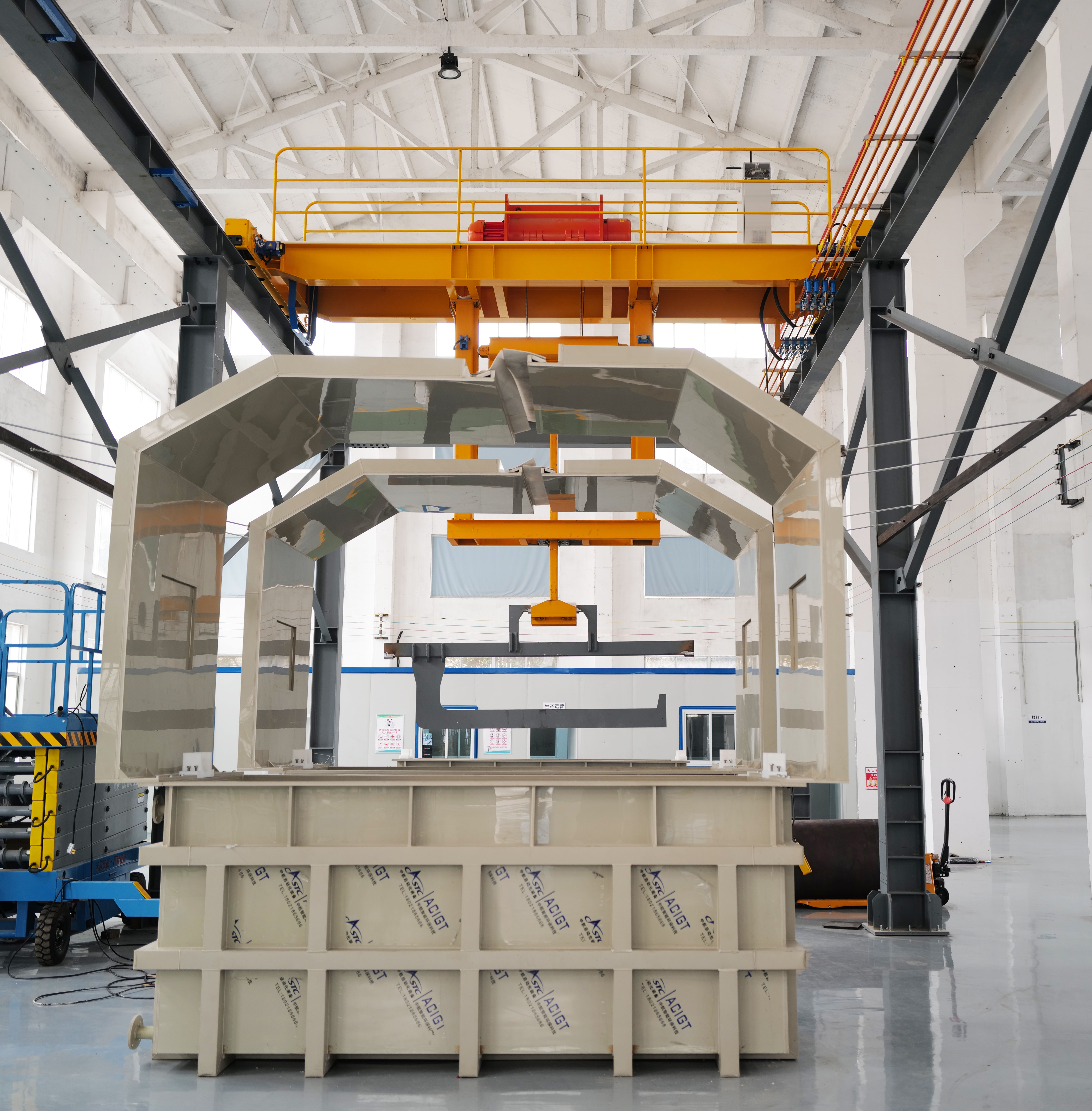 材料:型钢、钢网格板、焊管 结构:钢结构-承载梁、立柱、腰梁运行轨道+轨道钢制成,与机械手的行走轮接触,楼梯走道-走道板及栏杆 配置:钢结构采用工厂化生产;到达现场后按图采用高强度螺栓连接,可保证良好的承载性能,缩短施工周期;钢结构两侧布置,顶部安装轨道,供机械手行走;安装滑触线供电装置,为机械手供电;钢结构表面涂刷防腐漆;维修平台配备栏杆及安全门;全部钢结构经过探伤检测。